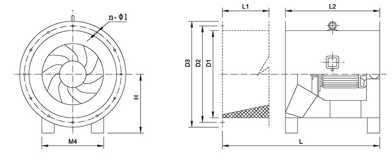 注:進風口可選配消聲頭,以進一步降低噪聲(5~12dB)如圖虛線所示,須在訂貨時注明,常規(guī)配置為不帶消聲頭。