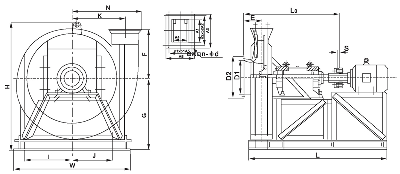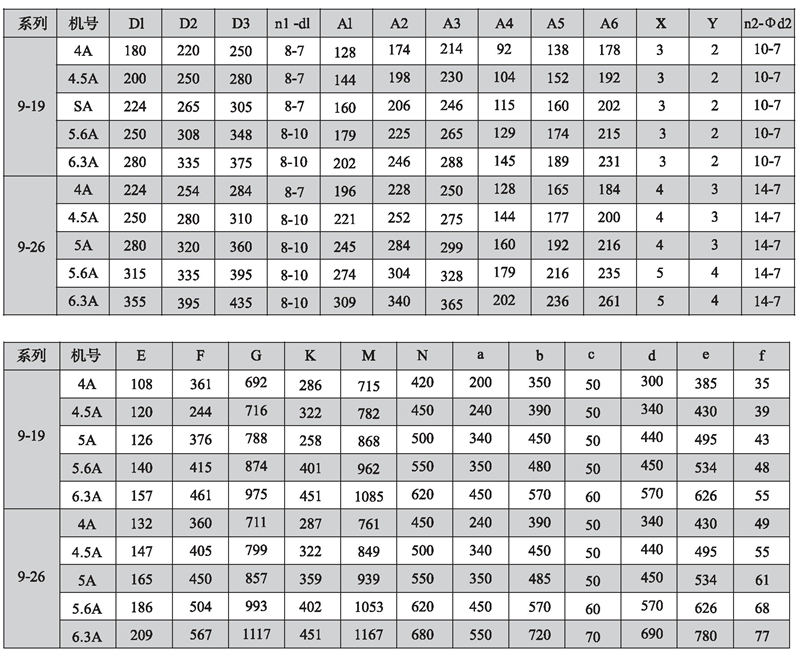 9-19、9-26系列4A~6.3離心風機外形尺寸圖、表